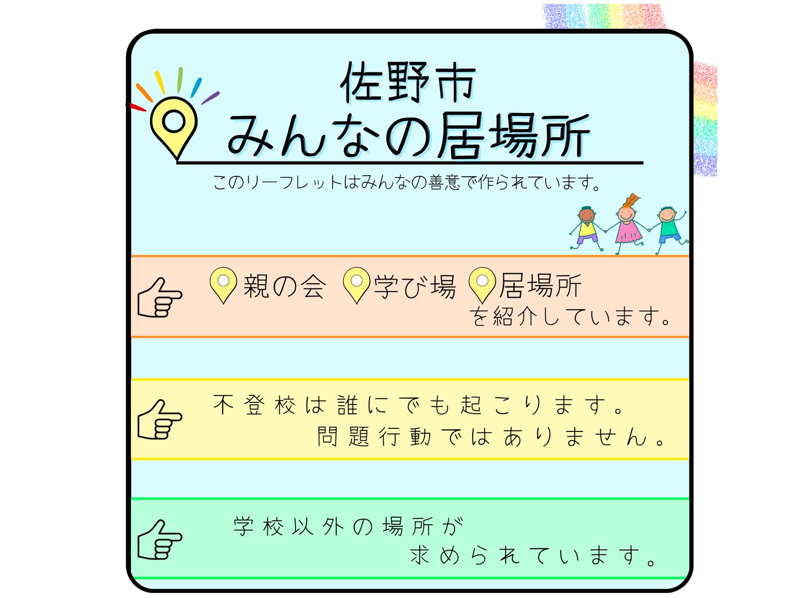学校に行きづらい子をもつ親が語り合い情報交換をすることで 1人で抱え込まず一緒に考えお互いに共感し合います。